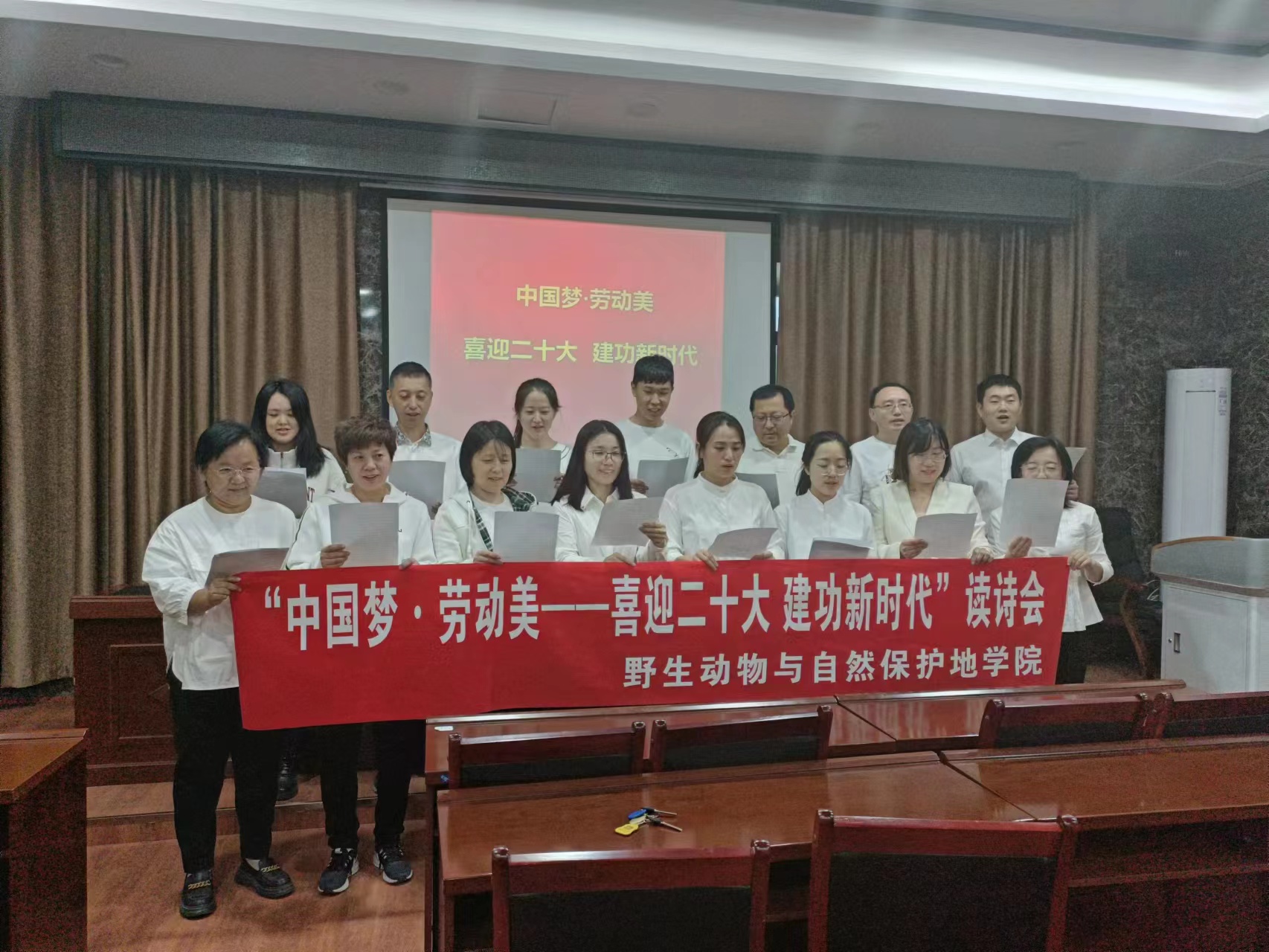 “你说悠史殇殇,沉痛悲怆,后来烽火寂寥,舐胆合伤……”,9月28日,野生动物与自然保护地学院“中国梦·劳动美——喜迎二十大建功新时代”读诗会在张圆圆老师创作的《我爱你,中国》诗歌声中拉开帷幕。虽然由于疫情防控要求不能聚集,大家分小组、分时段开展活动,但丝毫未减教职工们的热情,大家精神饱满、激情昂扬,声情并茂地诵读一首首经典诗篇,感悟革命的信仰和传承,感受催人奋进的力量,老师们的心灵受到了潜移默化的熏陶和感染,激发了浓浓的爱国热情和民族自豪感,对传承民族优秀文化、弘扬中华传统美德和加强师德师风建设也起到了积极的推动作用。(作者:张红梅 审稿:朱立明)