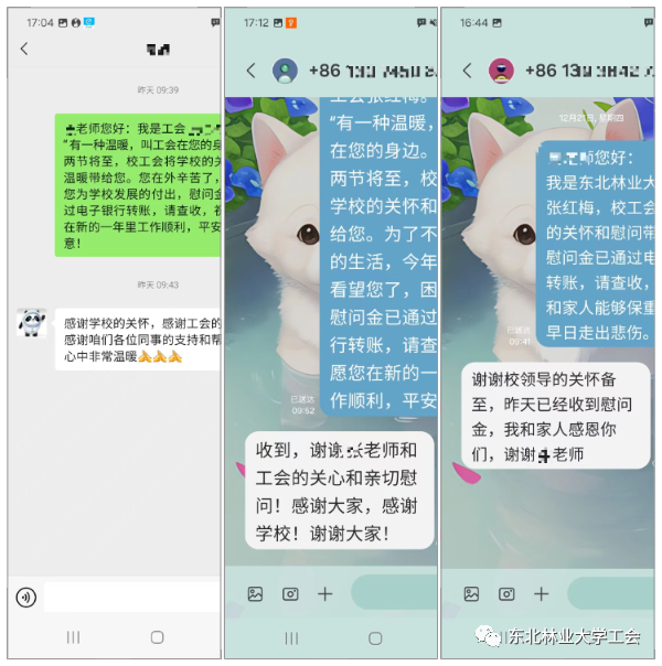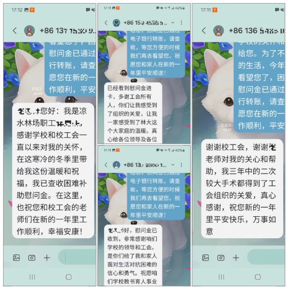 同一时间,学校工会也为困难教职工发放了补助慰问金,为在外挂职的教职工和去世教职工家属送去了慰问和新年祝福。“感谢学校和工会一直以来对我的关心,在这寒冷的冬日带给我这份温暖和祝福”、“感谢学校领导和工会,是你们给我和家人面对生活、对抗困难的信心和勇气”、“感谢学校和工会对我的关心和帮助,我三年中两次较大的手术都得到了组织的关爱,真心感谢。”……一段段情真意切的短信,也表达了教职工对学校的感激之情。