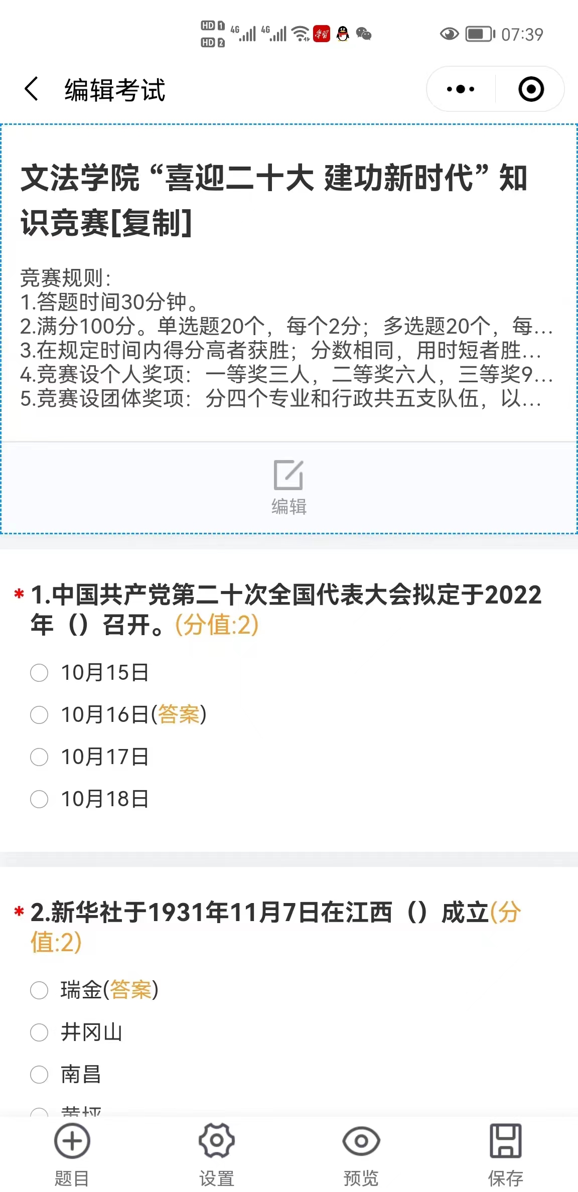 竞赛采取线上答题形式,通过问卷星小程序向全院教职工发布,内容包括党史、师德师风建设以及中国传统文化知识。题目设计分为单选题、多选题,限时30分钟,采取乱序方式发布,增加了答题的竞争性。竞赛设置集体奖和个人一二三等奖,充分调动了教职工的参与积极性。