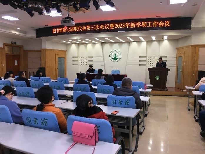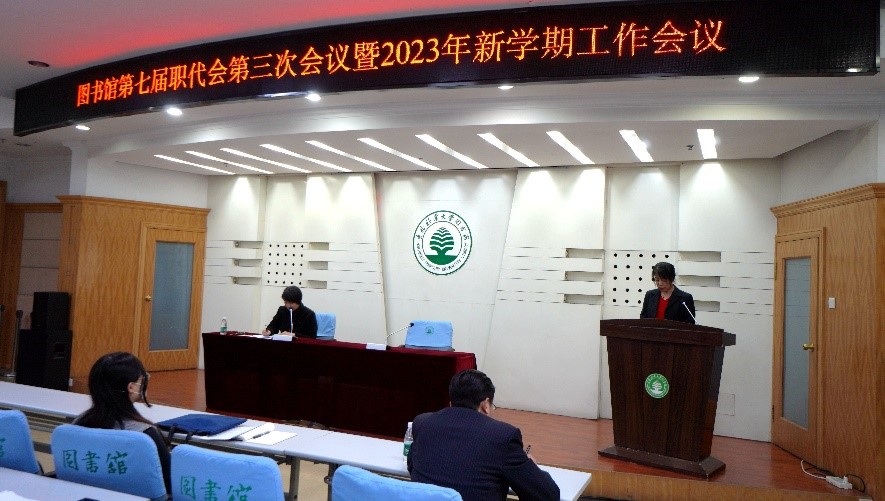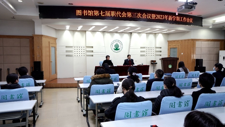 3月17日下午,图书馆召开第七届职工代表大会第三次会议暨2023年新学期工作会议。党总支书记魏晓慧主持会议。