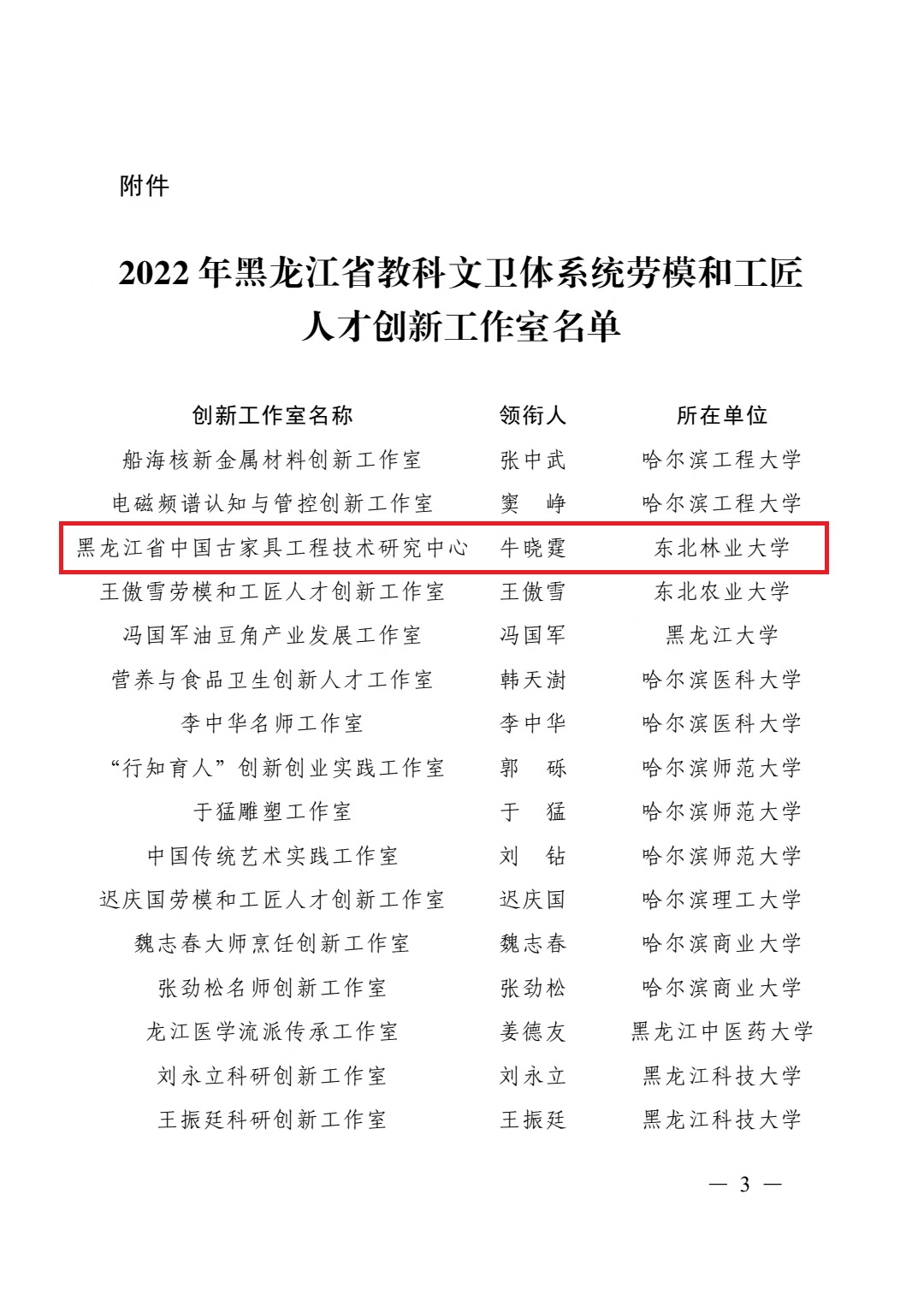 日前, 2022年黑龙江省教科文卫体系统“劳模和工匠人才创新工作室”评选结果揭晓,25个单位的33个工作室脱颖而出,由我校推荐的牛晓霆教授领衔的黑龙江省中国古家具工程技术研究中心荣获黑龙江省教科文卫体系统“劳模和工匠人才创新工作室”荣誉称号。