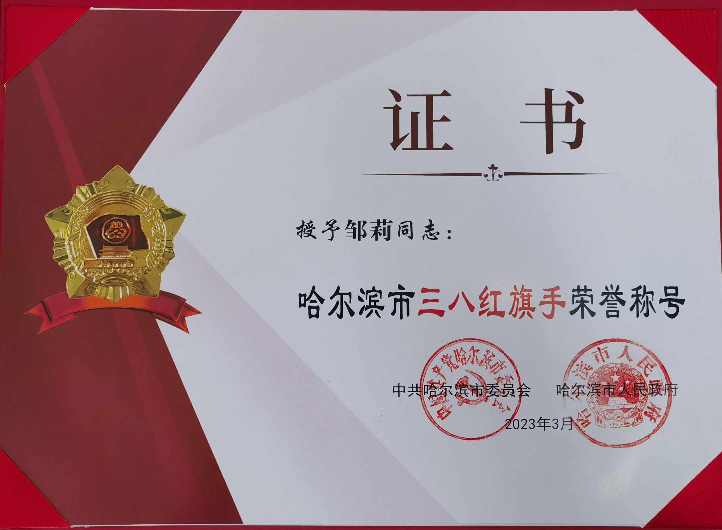 我校邹莉教授荣获哈尔滨市“三八红旗手”荣誉称号