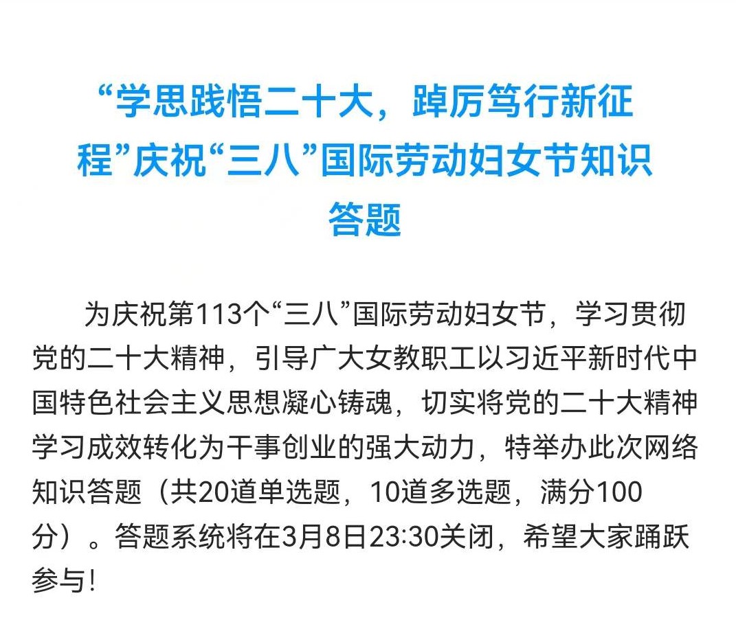 3月3日至3月8日,组织开展了以学习党的二十大精神为主要内容的线上答题活动,引导广大女教职工以习近平新时代中国特色社会主义思想凝心铸魂,切实将党的二十大精神学习成效转化为干事创业的强大动力,为学校高质量发展赋能聚力。