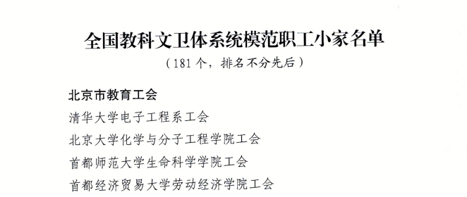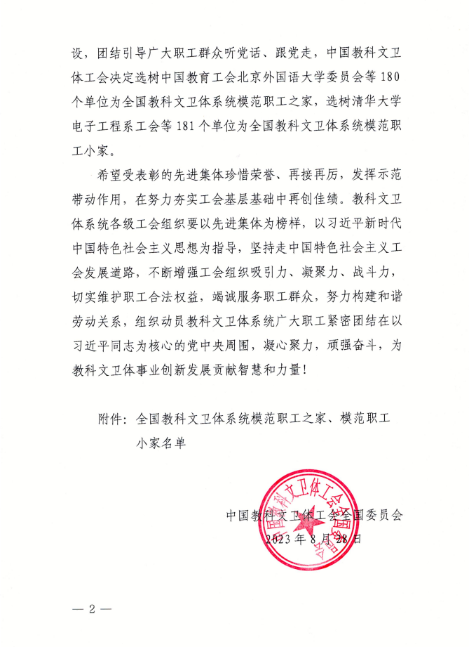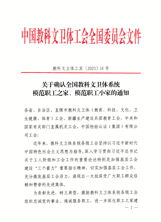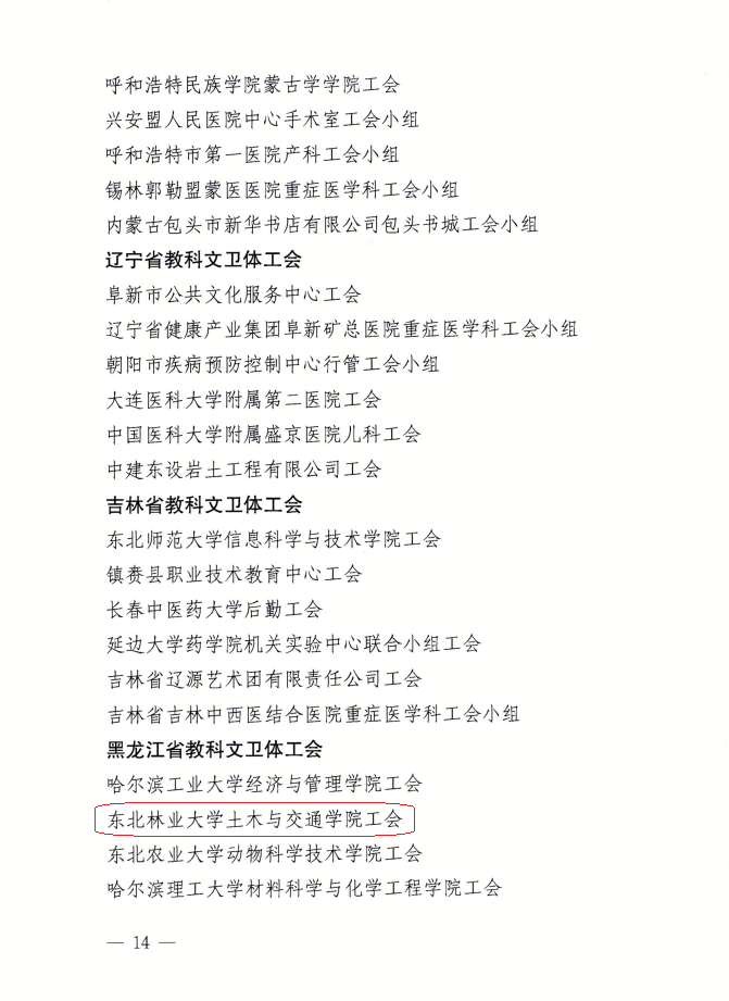 日前,中国教科文卫体工会全国委员会下发《关于确认全国科教文卫体系统模范职工之家、模范职工小家的通知》(科教文卫体工发〔2023〕14号),我校土木与交通学院工会被选树为“全国科教文卫体系统模范职工小家”。据悉,本次全国共评选了181家“全国科教文卫体系统模范职工小家”,黑龙江省有6家获此殊荣。
