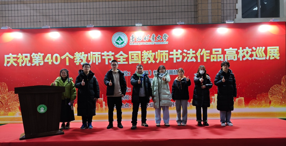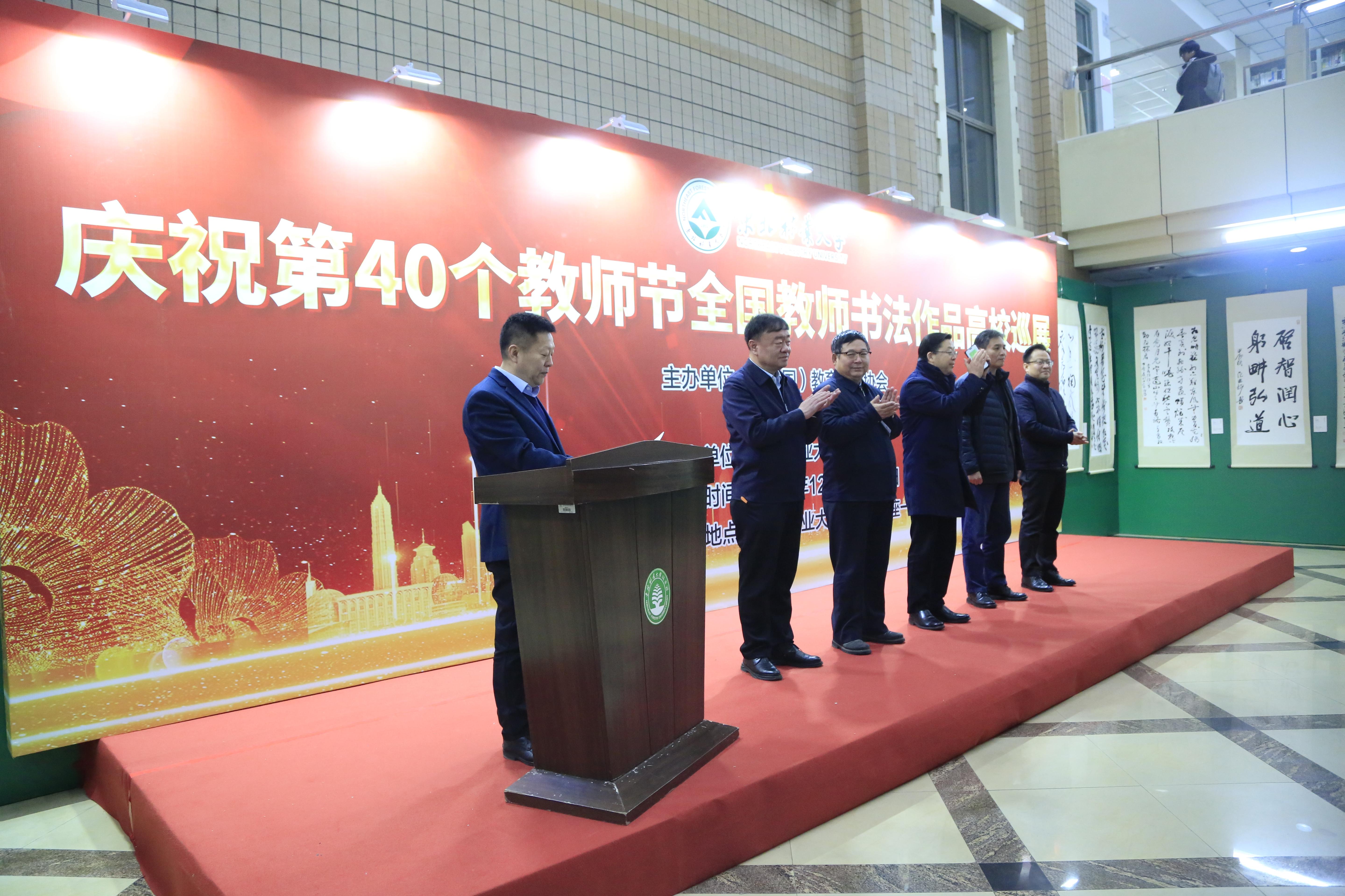 12月5日上午,庆祝第40个教师节全国教师书法作品高校巡展(东北林业大学站)在学校图书馆A座一楼展厅开幕。全国教育书画协会会长刘利、驻会副会长杨晓辉、秘书长张燕军,我校党委书记张志坤,党委常委、副校长孙猛、翟雪峰以及学校“大学生德智体美劳一体化教育工作领导小组”成员单位负责人、相关部门负责人、各基层工会主席、书法协会师生、留学生代表、离退休教师代表等出席开幕式。开幕式由学校党委常委、副校长翟雪峰主持。